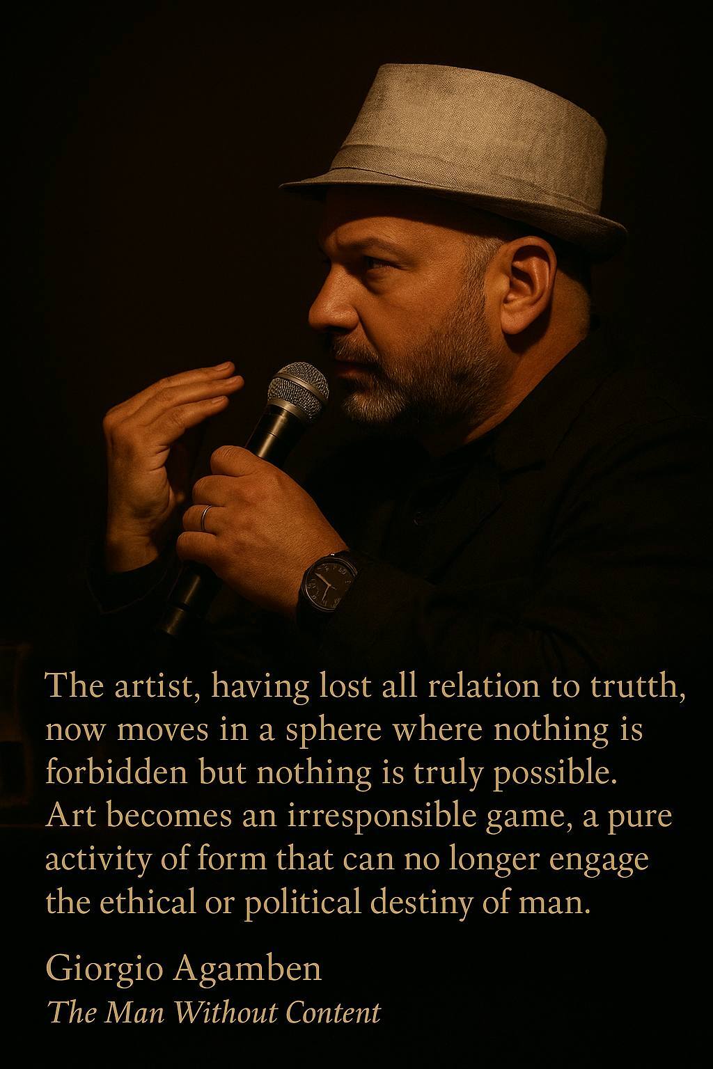 “The artist, having lost all relation to the truth, now moves in a sphere where nothing is forbidden but nothing is truly possible. Art becomes an irresponsible game, a pure activity of form that can no longer engage the ethical or political destiny of man.”