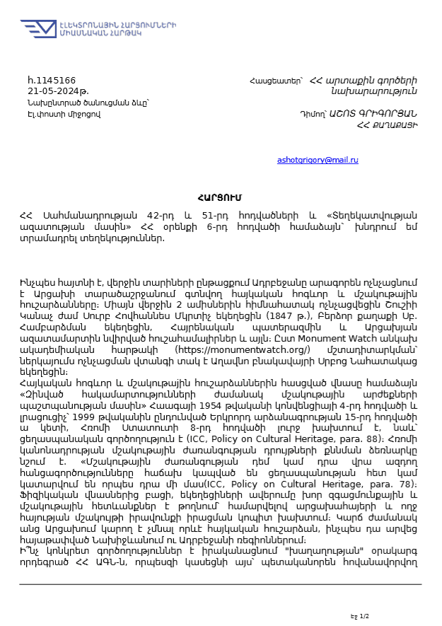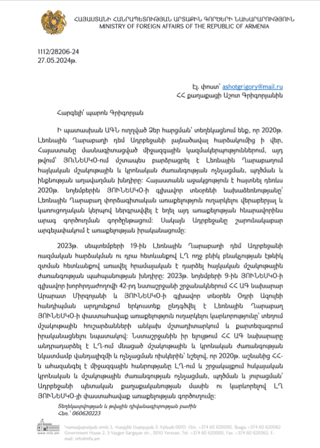Ստորև Աշոտ Գրիգորյանի և ԱԳՆ-ի նամակարգրությունը՝ արցախի հուշարձանները փրկելու հարցով