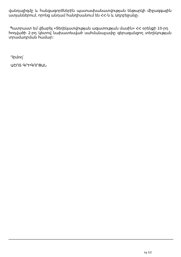 Վերջերս այս մտահոգություններով հարցում ուղղեցի ՀՀ Արտաքին գործերի նախարարությանը՝ պարզելու, թե ի՞նչ կոնկրետ գործողություններ է իրականացնում «խաղաղության» օրակարգ որդեգրած ՀՀ ԱԳՆ-ն, որպեսզի կասեցնի այս՝ Ադրբեջանի կողմից պետականորեն հովանավորվող վանդալիզմը և հանցագործներին պատասխանատվության ենթարկի միջազգային ատյաններում, որոնց անդամ են ՀՀ-ն և Ադրբեջանը։