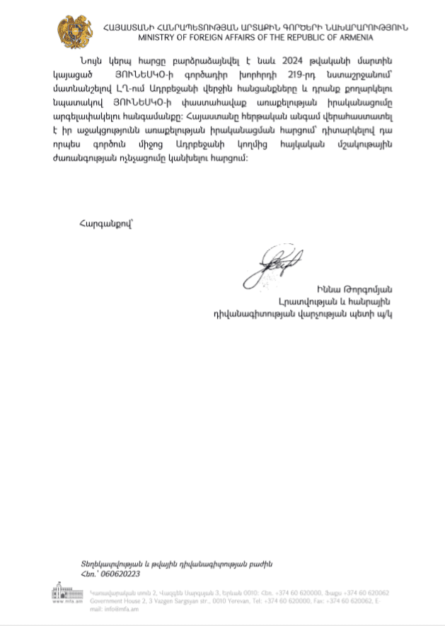 Նշվում էր, որ 2020թ-ից ի վեր Հայաստանը մասնագիտացված միջազգային կազմակերպություններում, այս թվում՝ ՅՈՒՆԵՍԿՕ-ում մշտապես բարձրացրել է Լեռնային Ղարաբաղում հայկական մշակութային և կրոնական ժառանգության ոչնչացման, պղծման և ինքնության աղավաղման խնդիրը։