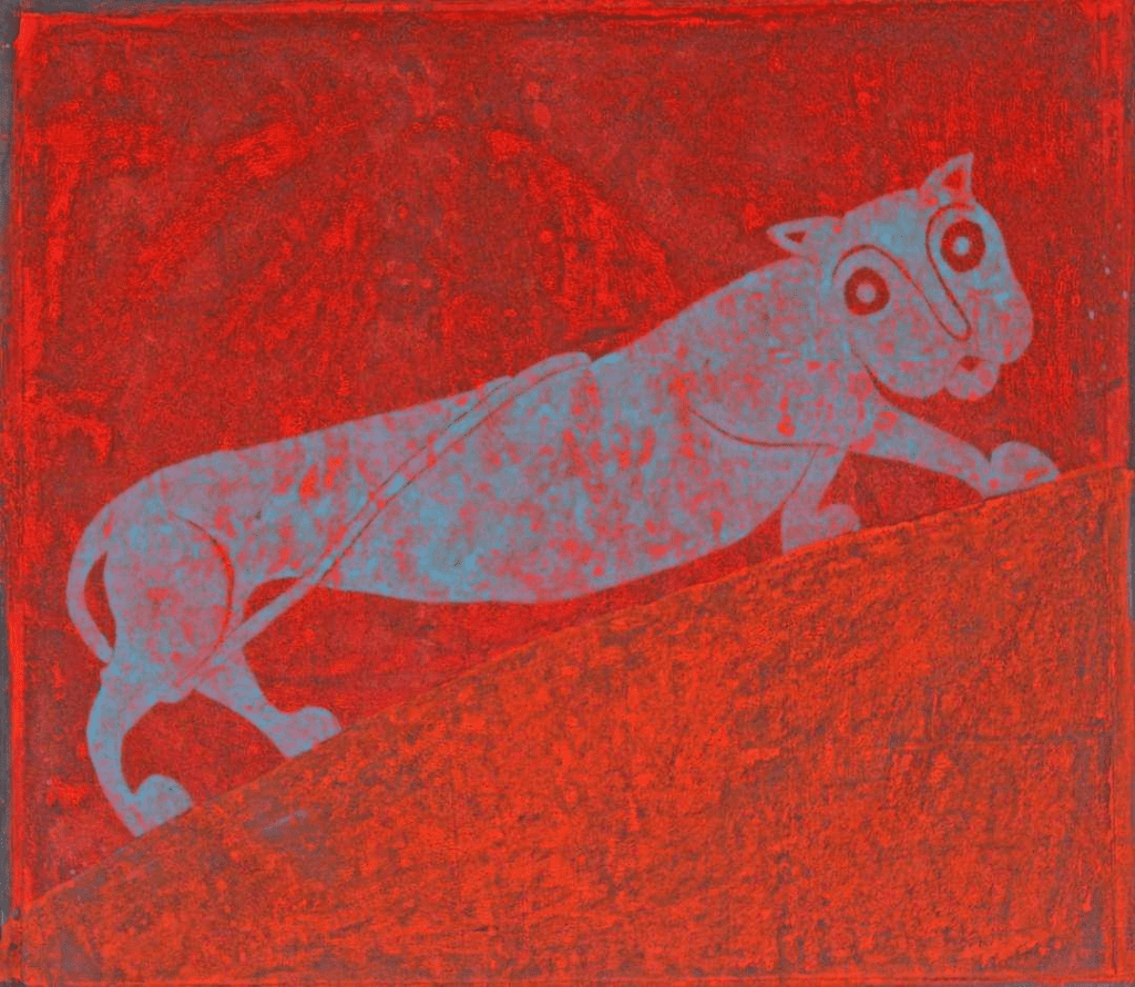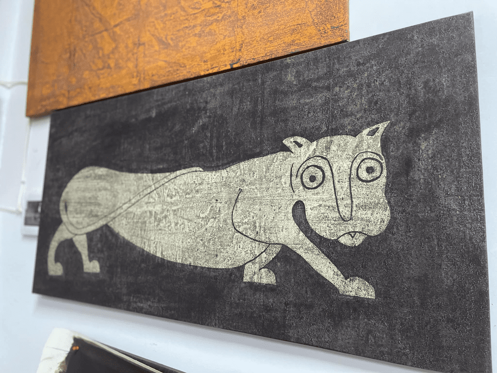 – Մեր վաղ միջնադարյան պատկերաքանդակից ա գալիս։ Հիմա սա Վասակ Սյունու վագրն ա։ Ես, որպես սյունեցի, որպես պատրիոտ, մինչև հիմա, էն գլխից էլ, էրեխա վախտվանից էլ, գիտեի, որ Վասակ Սյունին դավաճան չի։ Եվ ես որոշ աշխատանքների մեջ իրան անդրադարձել եմ էդ անկյան տակ։ Սա Վասակ Սյունու վագրն ա։ Ինքն անհաղթահարելի ա։